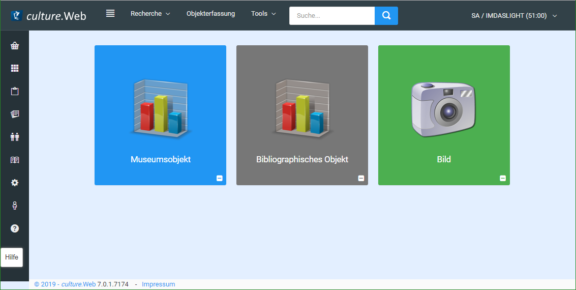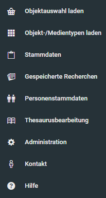 Der Funktionsbereich bietet Möglichkeit, Objektauswahl zu laden, Objekt-/Medientypen zu laden, Stammdaten zu erfassen, Personenstammdaten zu verwalten, Thesauri zu bearbeiten, die Administration des Systems vorzunehmen sowie allegemeine Seiten wie Kontakt und Hilfe aufzurufen.
